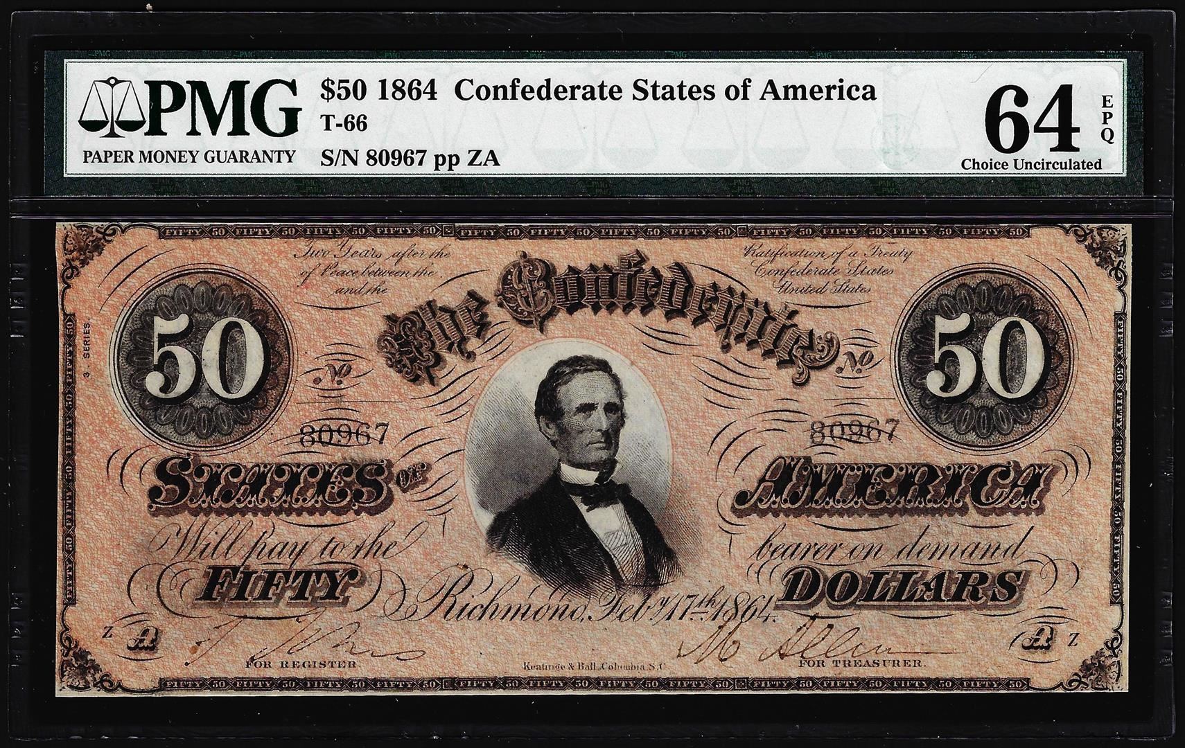 1864 $50 Confederate States of America Note T-66 PMG Choice Uncirculated 64EPQ