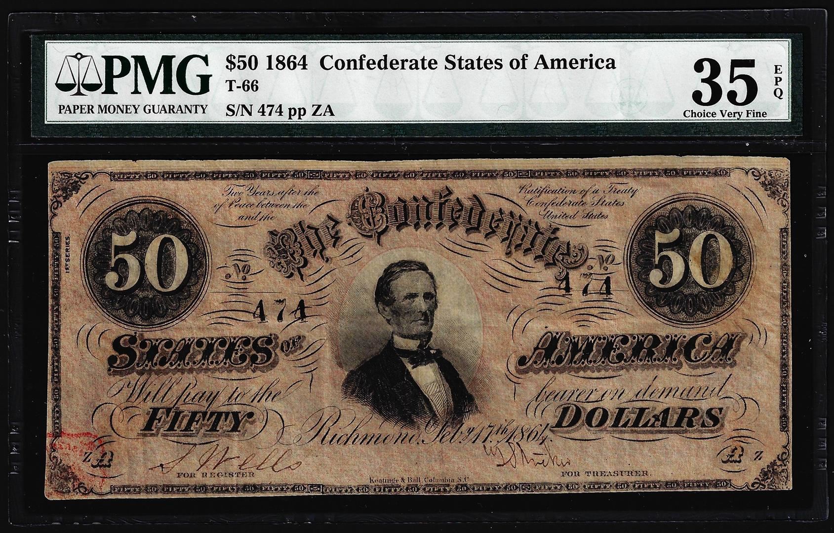 1864 $50 Confederate States of America Note T-66 PMG Very Fine 35EPQ Low Serial Number