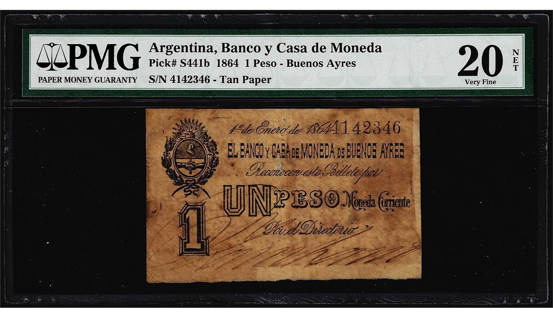 1864 Argentina Banco y Casa de Moneda Un Peso Pick# S441b Note PMG Very Fine 20 NET