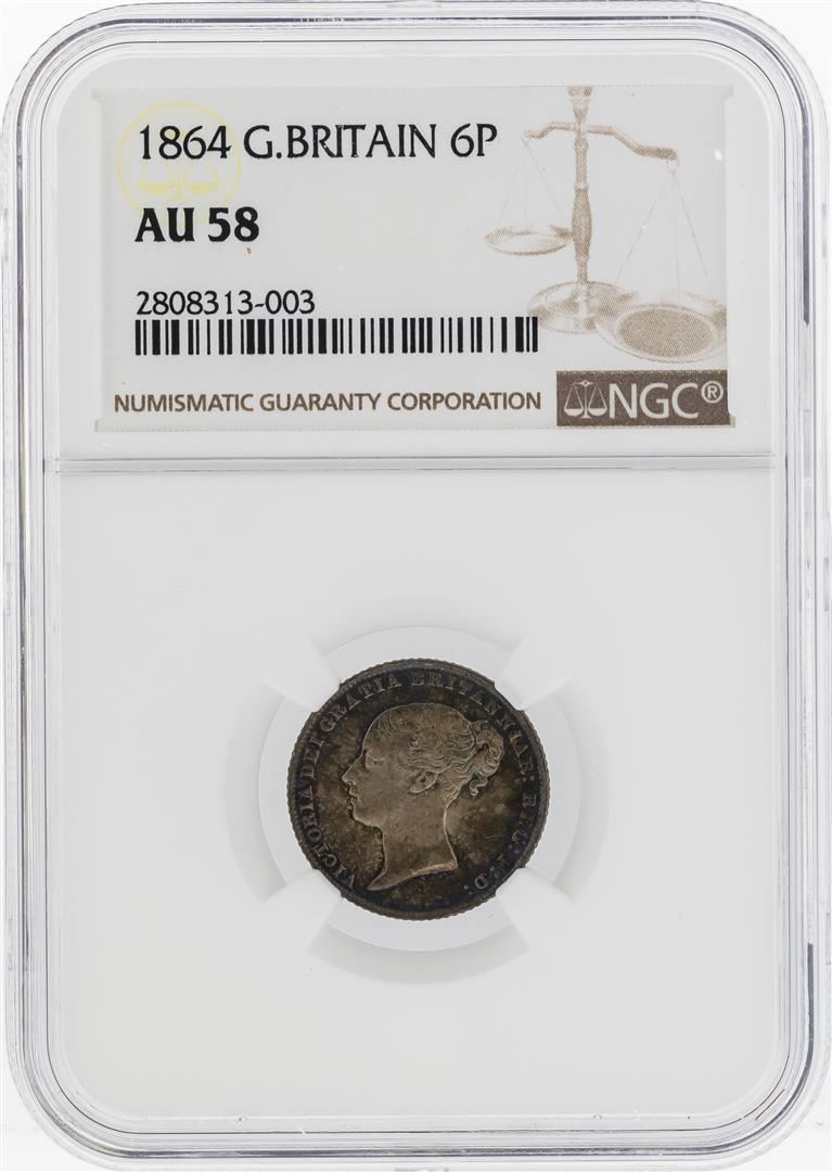 One 1864 Great Britain 6 Pence Silver Coin NGC AU58. NGC Certified.