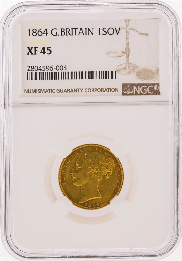 One 1864 Great Britain Gold Sovereign Coin NGC Graded XF45. NGC Certified.