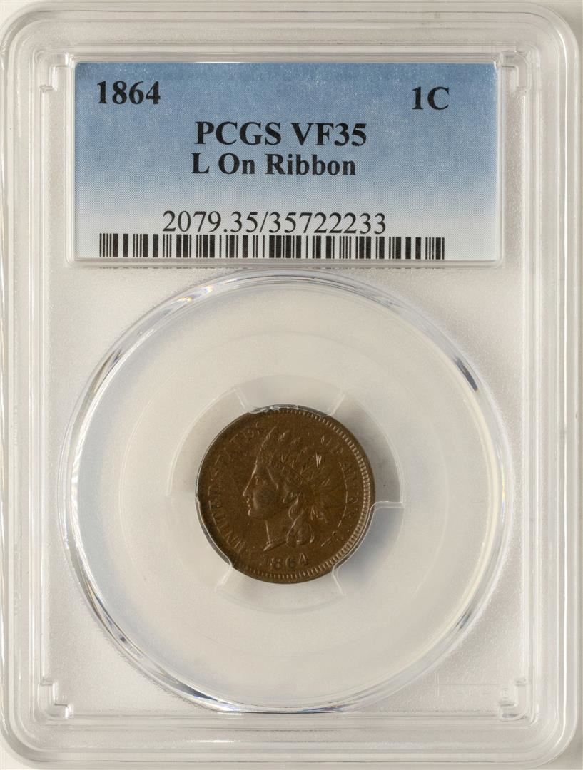 One 1864 Indian Head Cent Coin PCGS VF35 L on Ribbon. PCGS Graded.