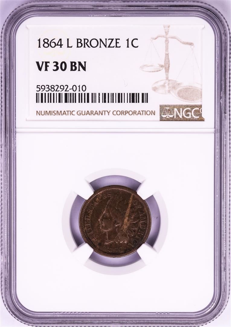 One 1864 L Bronze Indian Head Cent Coin NGC VF30BN. NGC Certified.