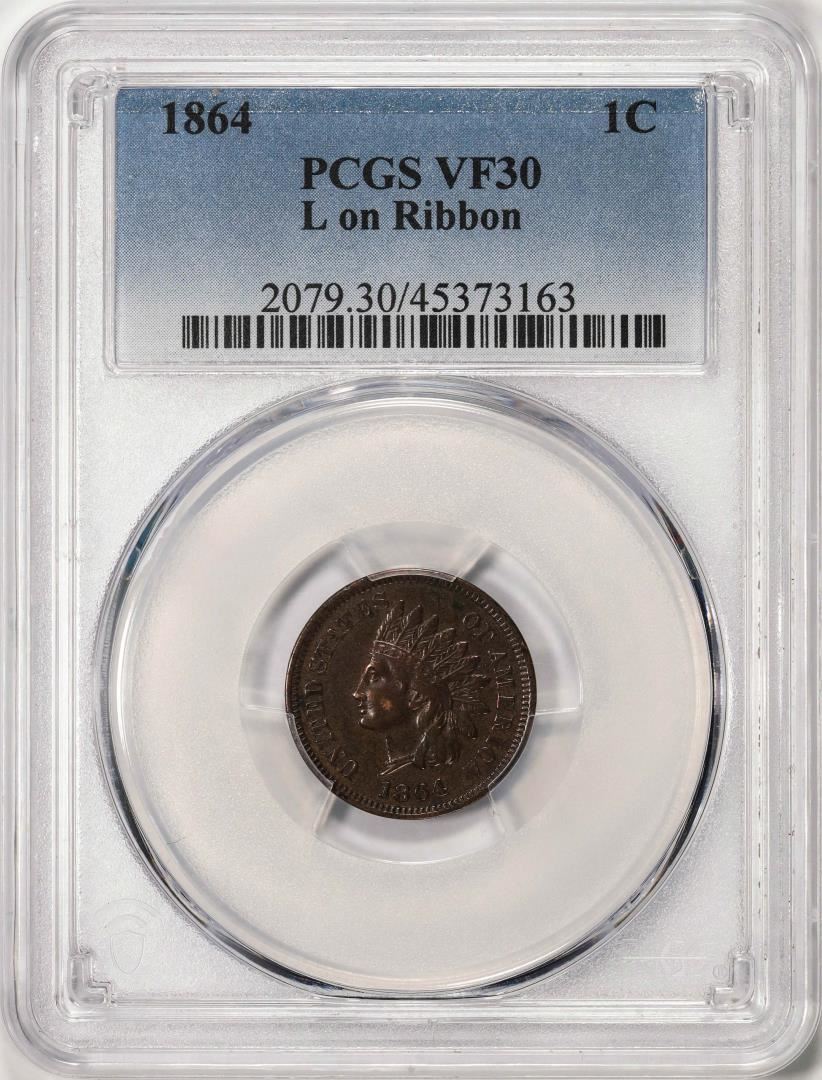 One 1864 L on Ribbon Indian Head Cent Coin PCGS VF30. PCGS Graded.