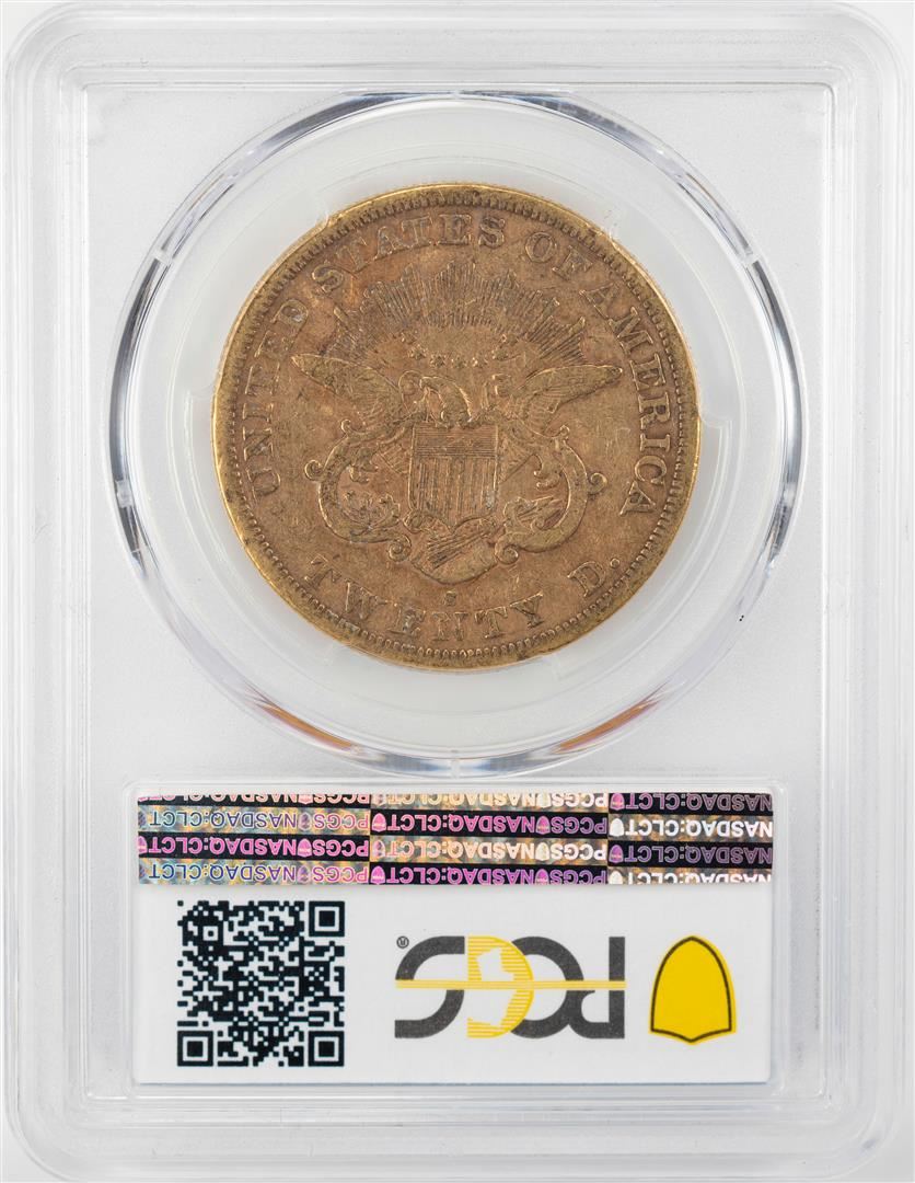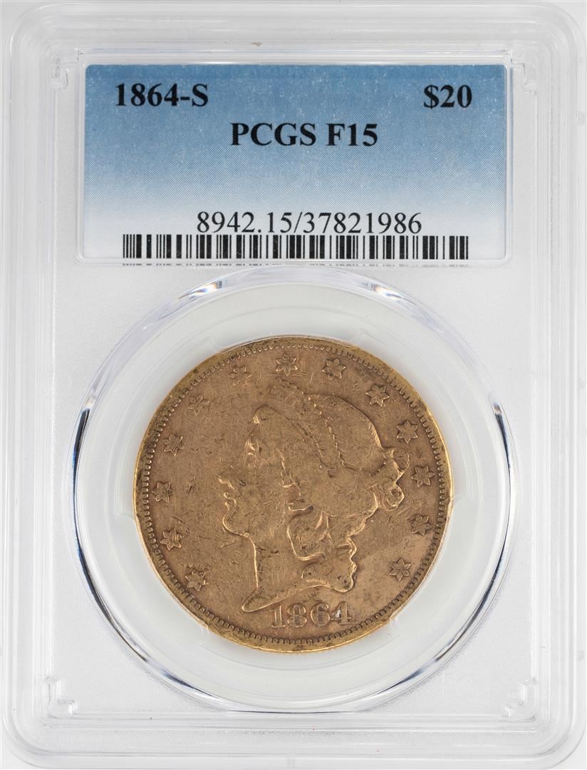 One 1864-S $20 Liberty Head Double Eagle Gold Coin PCGS F15. PCGS Graded.