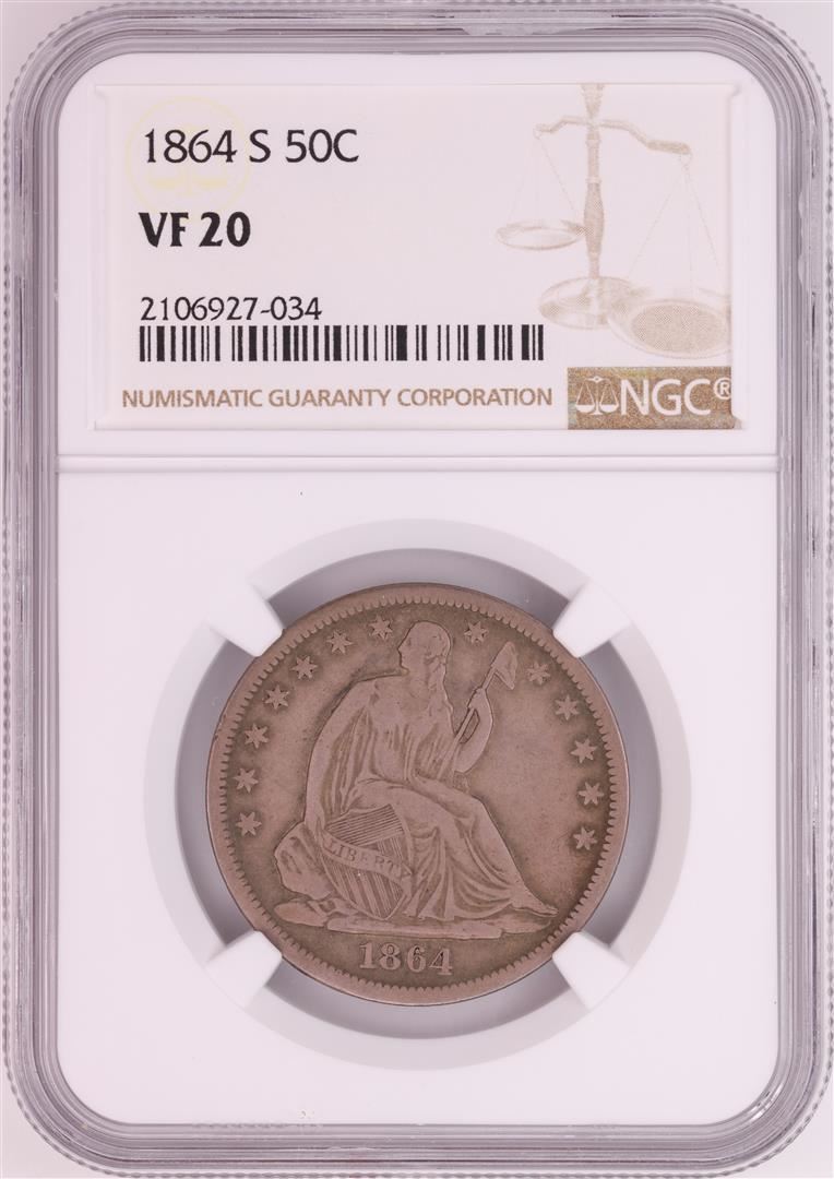 One 1864-S Seated Liberty Half Dollar Coin NGC VF20. NGC Certified.