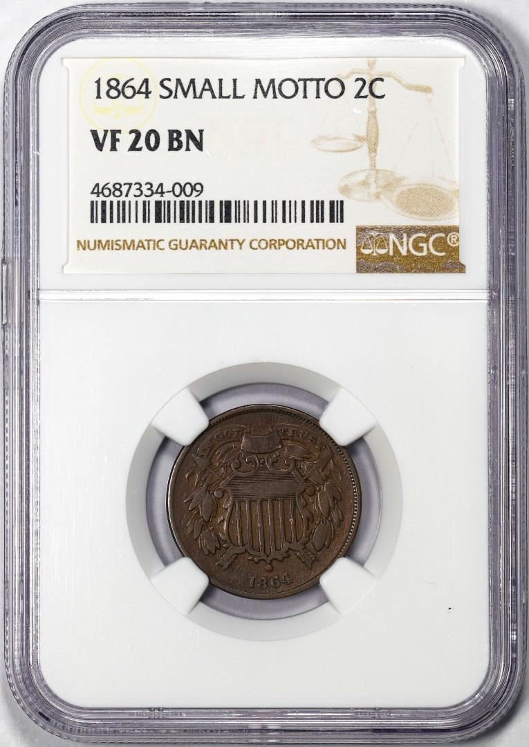 One 1864 Small Motto Two Cent Piece Coin NGC VF20BN. NGC Certified.