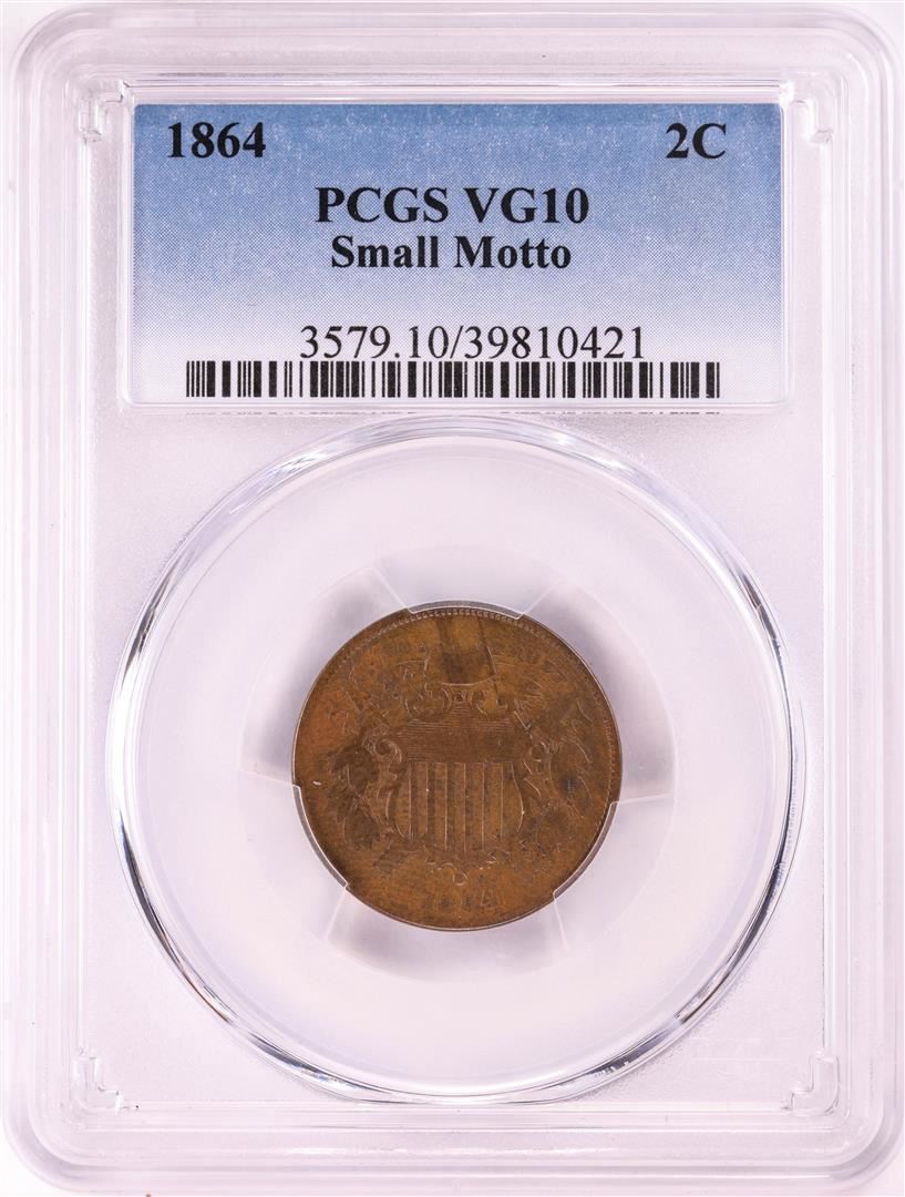 One 1864 Small Motto Two Cent Piece Coin PCGS VG10. PCGS Graded.