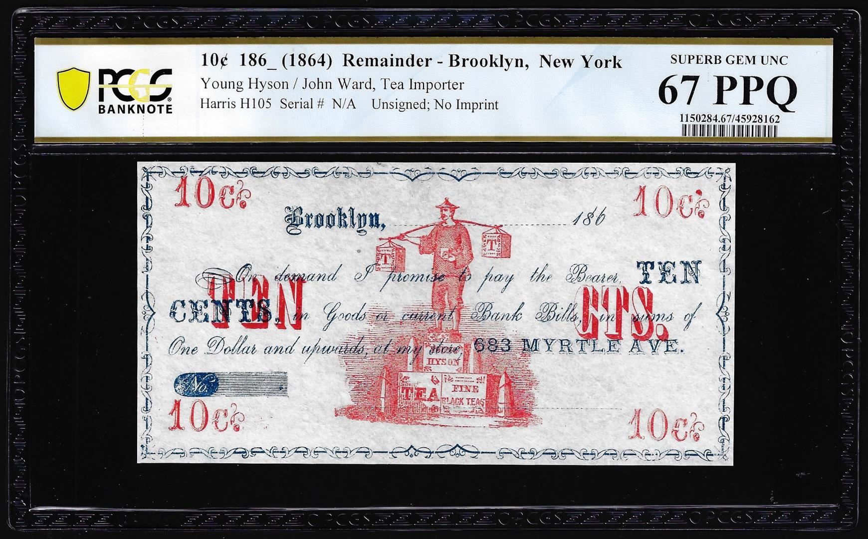 One 1864 Ten Cents Young Hyson Brooklyn, NY Remainder Banknote PCGS Superb Gem Unc 67PPQ. PCGS Graded.