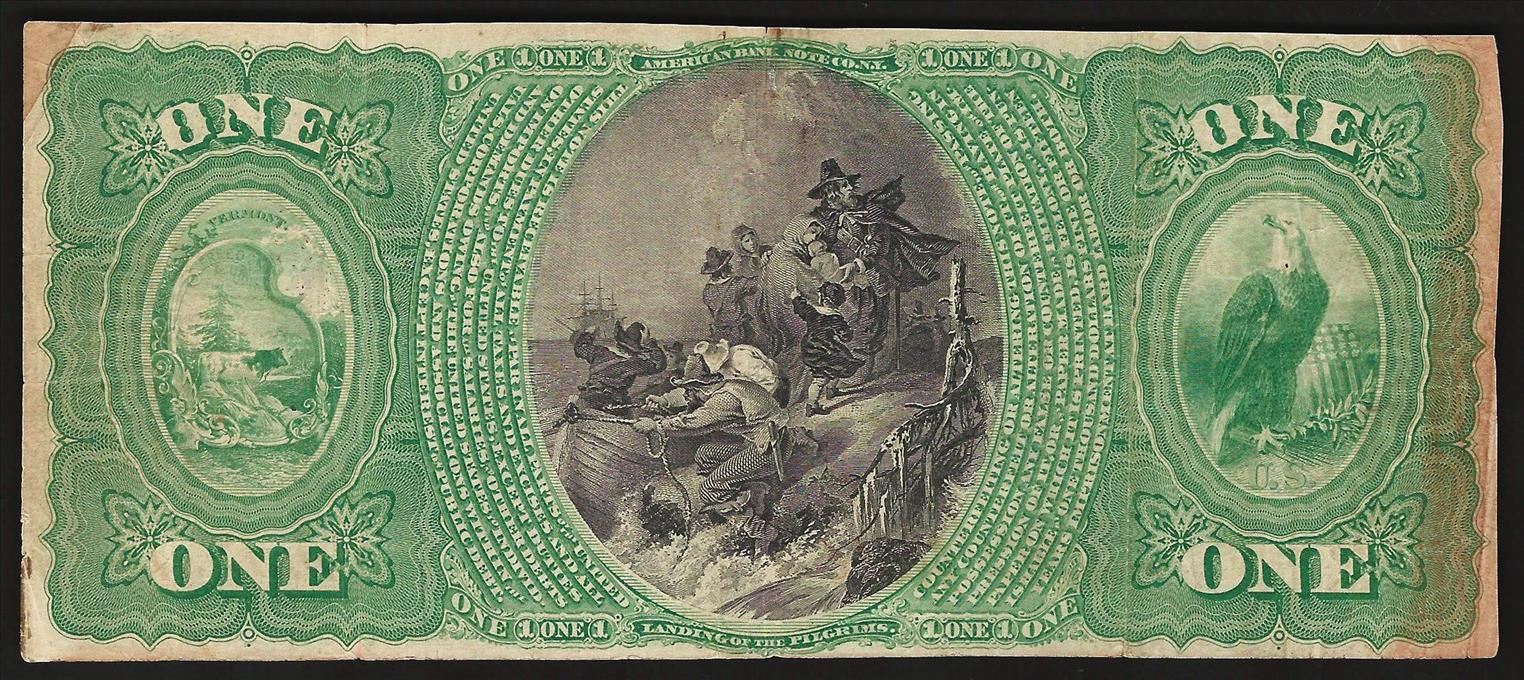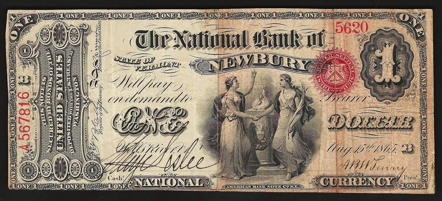 One 1865 $1 National Bank Newbury State of Vermont Currency Note.