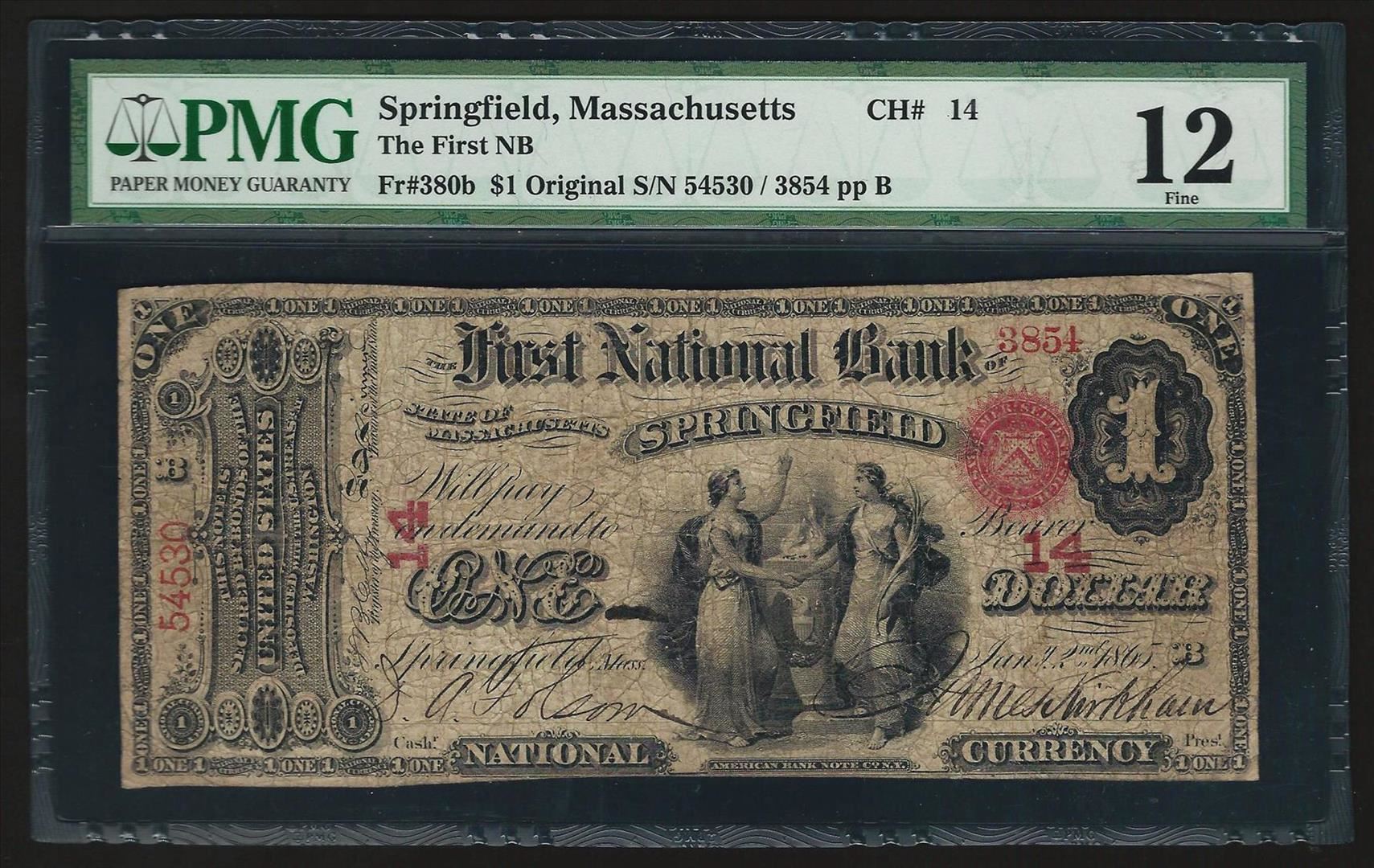 One 1865 $1 National Bank Springfield MA Currency Note PMG F12. PMG Certified.