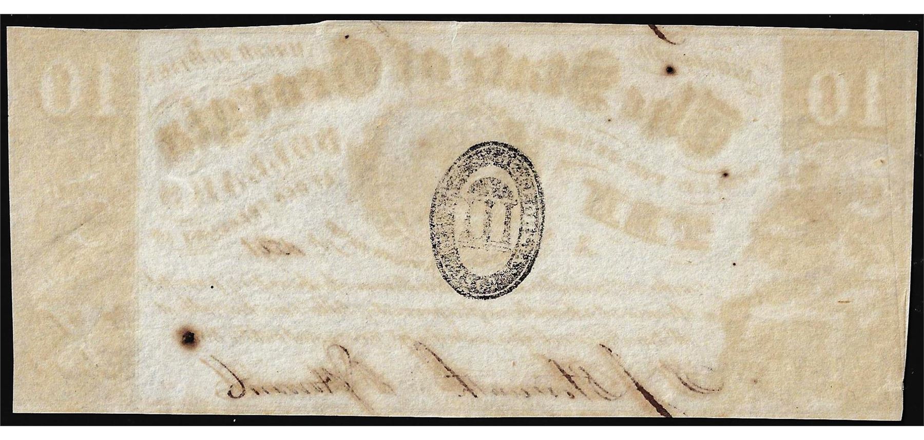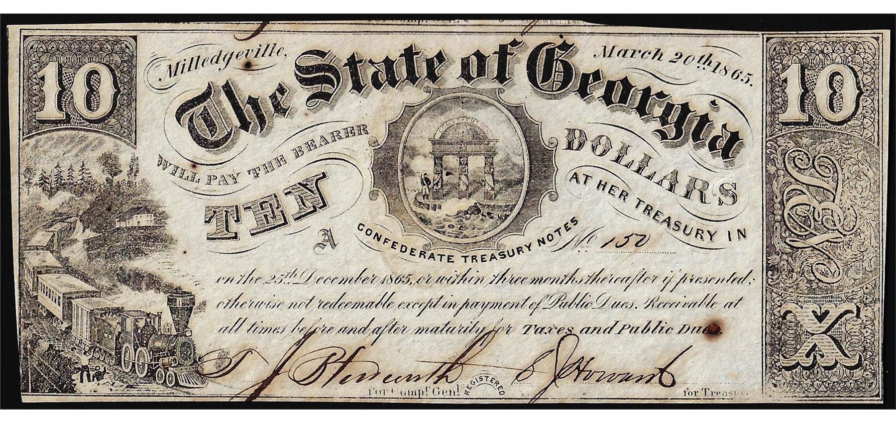 One 1865 $10 State of Georgia Milledgeville, GA Obsolete Note.