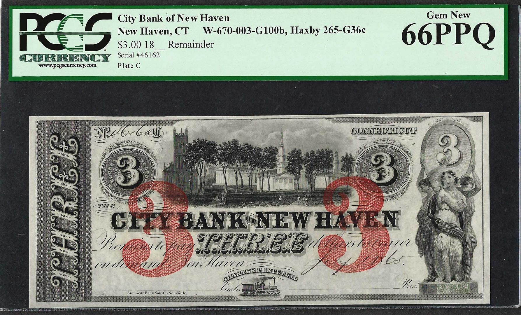 One 1865 $3 City Bank of New Haven Obsolete Note PCGS Gem New 66PPQ. PCGS Graded.