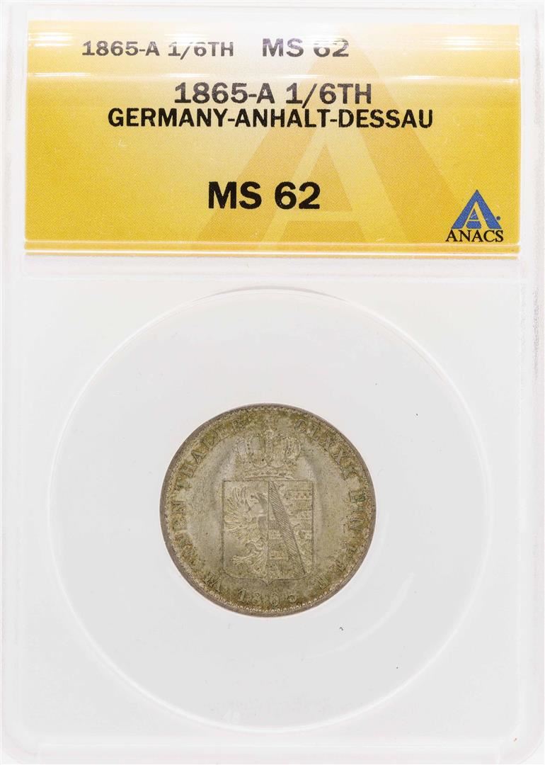 One 1865-A Germany-Anhalt-Dessau 1/6TH Coin ANACS MS62. ANACS Certified.