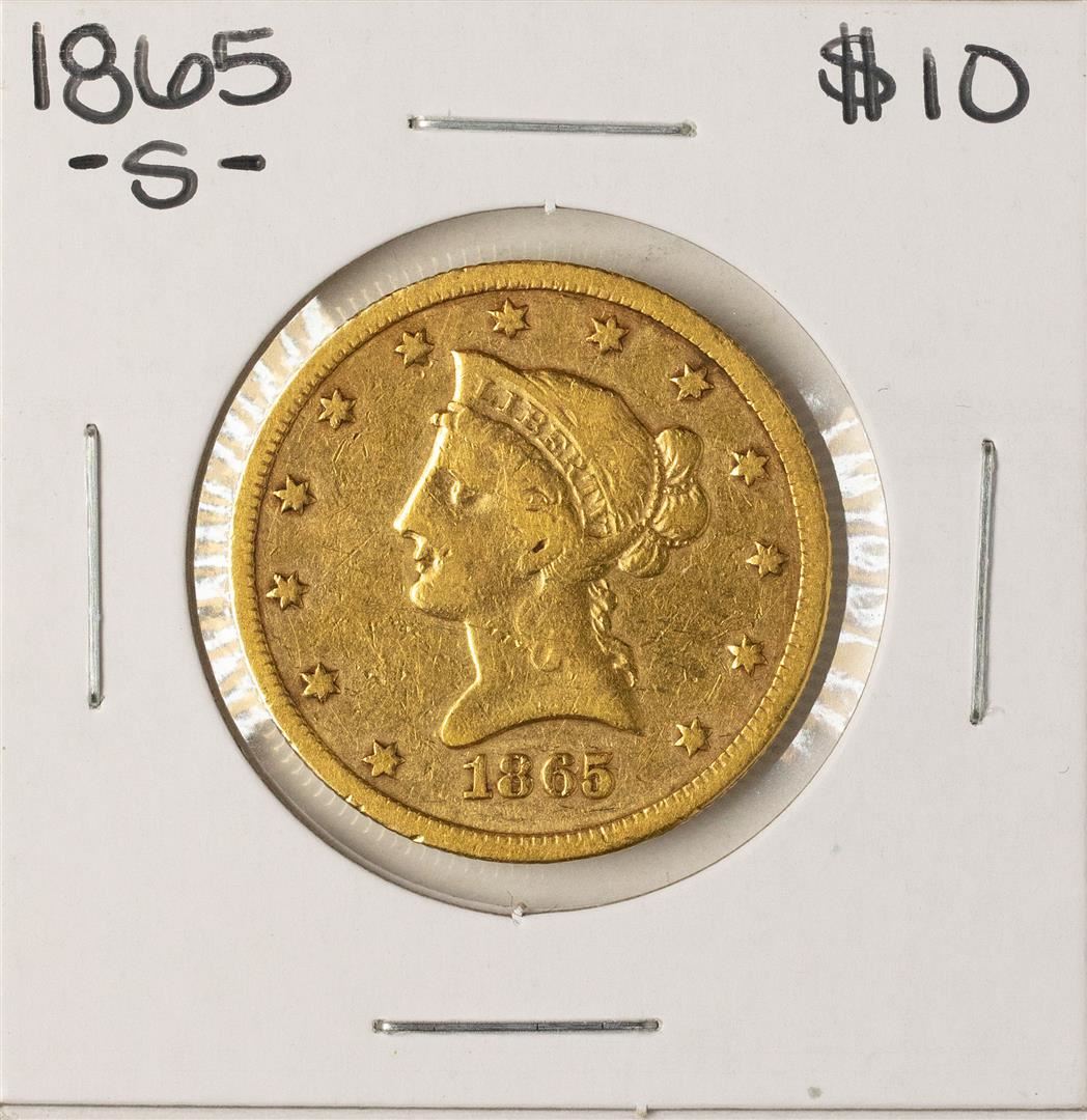 One 1865-S $10 Liberty Head Eagle Gold Coin.