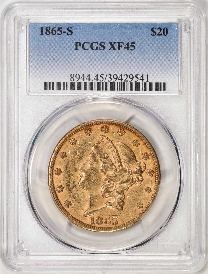 One 1865-S $20 Liberty Head Double Eagle Gold Coin PCGS XF45. PCGS Graded.