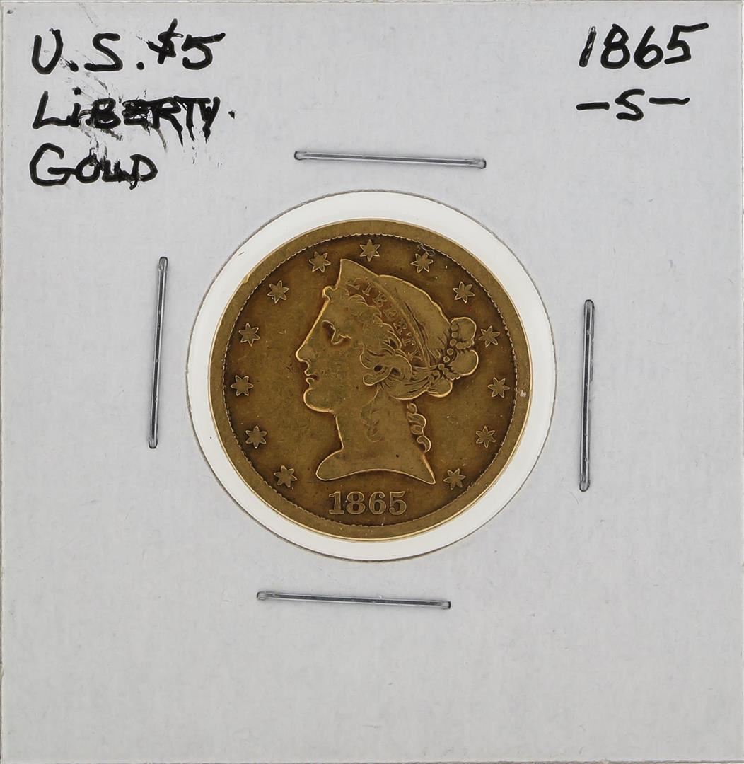 One 1865-S $5 Liberty Head Half Eagle Gold Coin .