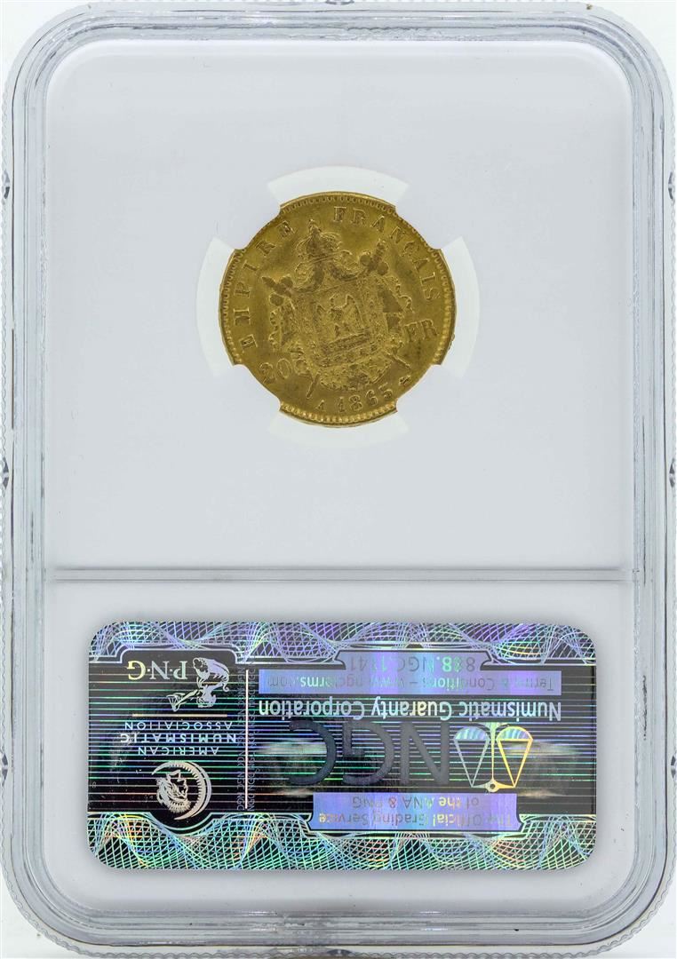 One 1865A France 20 Francs Gold Coin NGC AU55. NGC Certified.