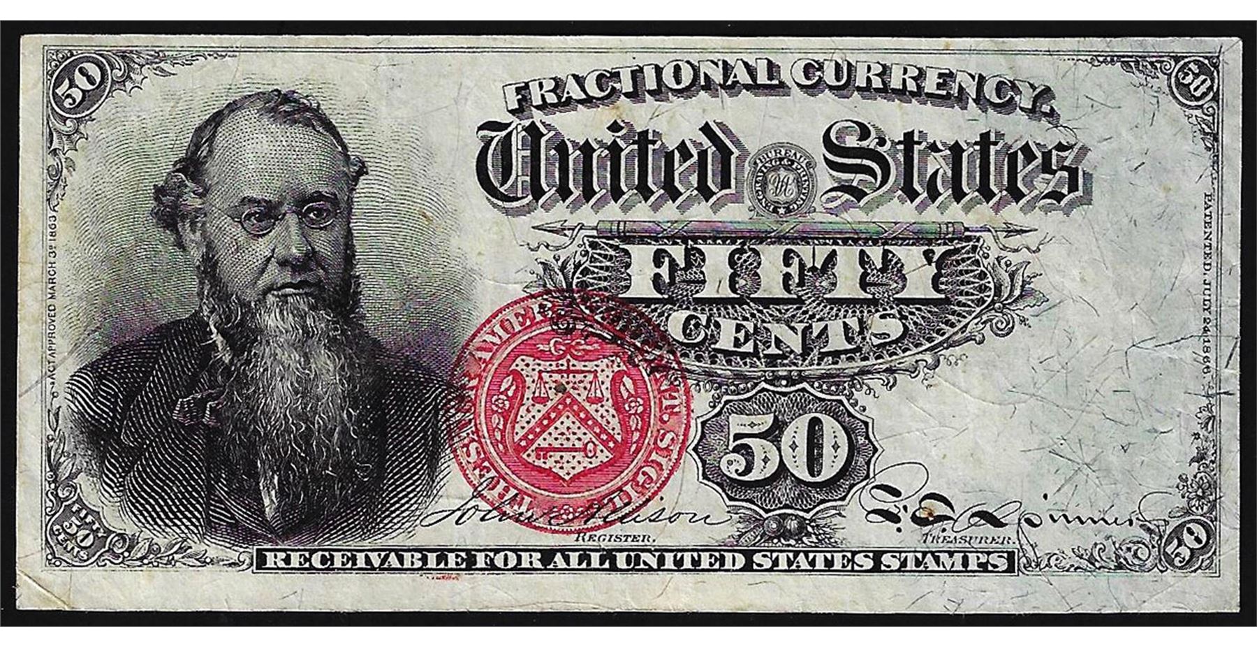 One 1866 Fifty Cents Fourth Issue Fractional Currency Note.