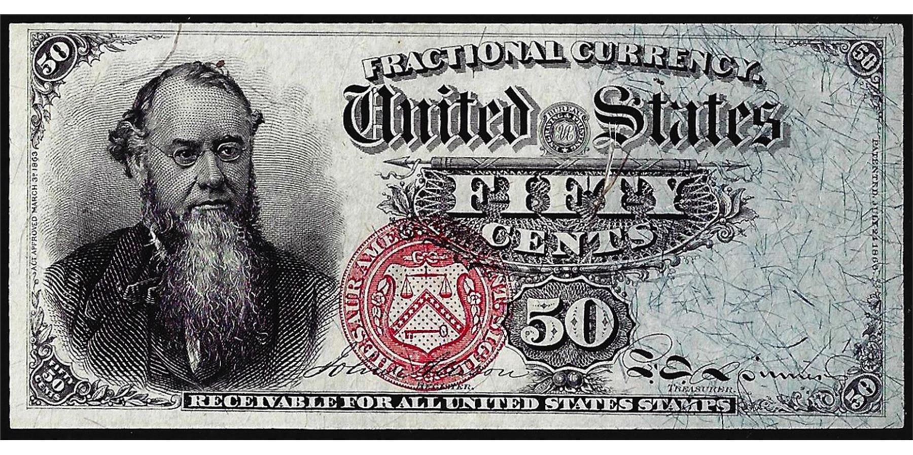 One 1866 Fourth Issue Fifty Cents Fractional Currency Note.