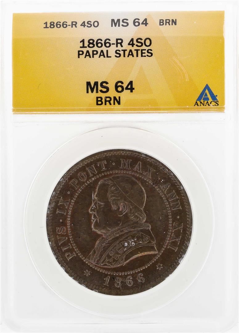 One 1866-R 4 Soldi Italian Papal States Coin ANACS MS64BRN. ANACS Certified.
