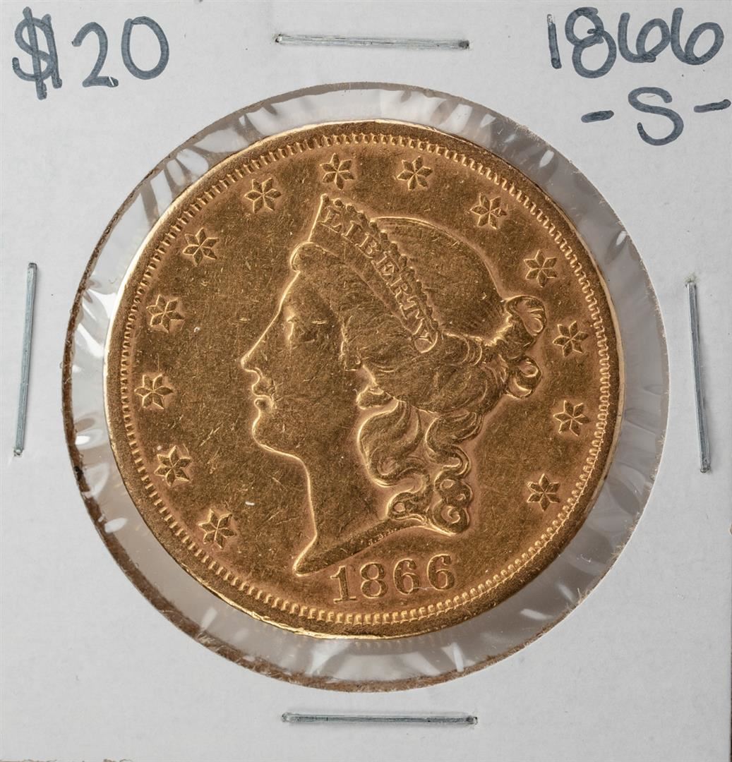 One 1866-S $20 Liberty Head Double Eagle Gold Coin.