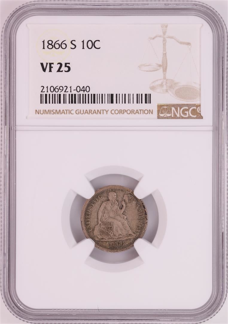 One 1866-S Seated Liberty Dime Coin NGC VF25. NGC Certified.