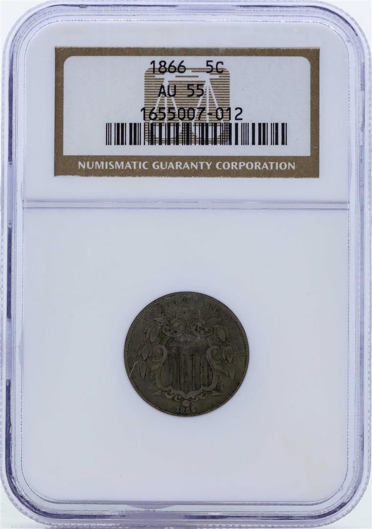 One 1866 Shield Nickel with Rays Coin NGC AU55. NGC Certified.