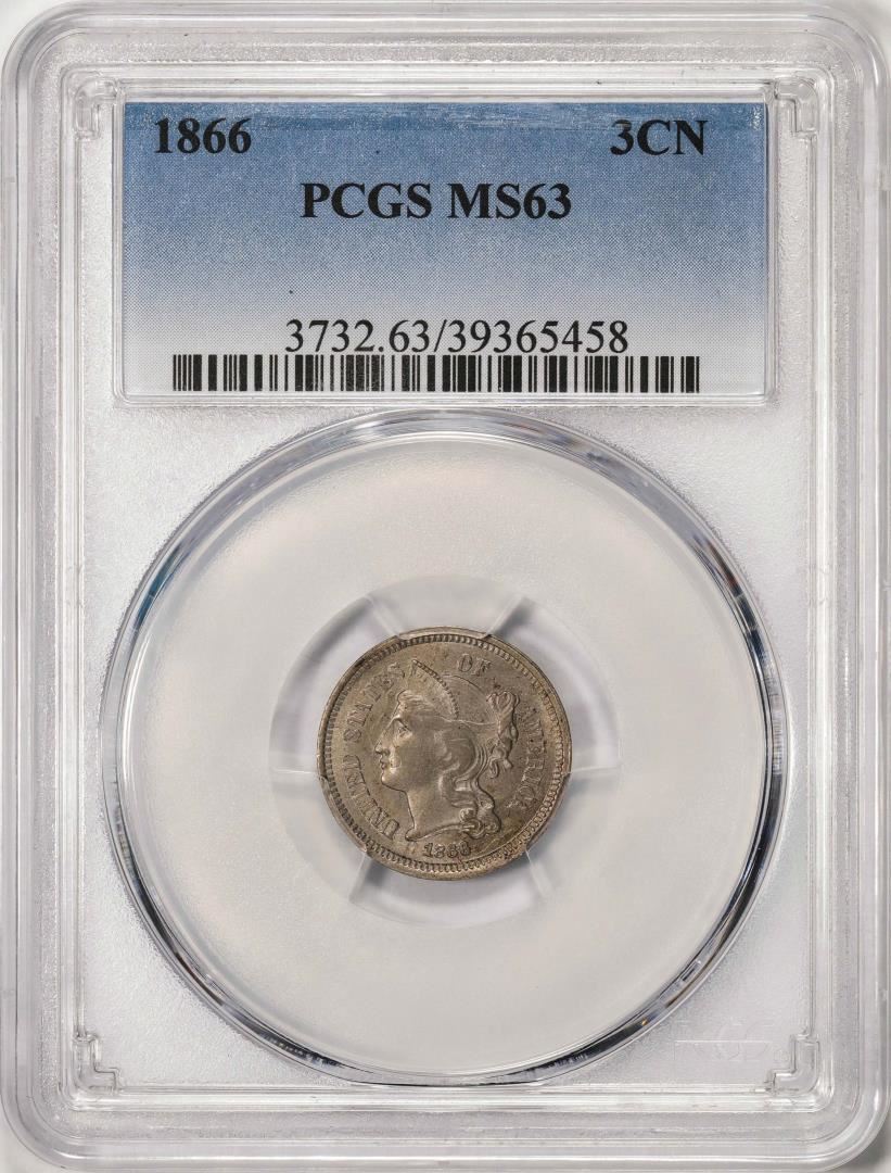 One 1866 Three Cent Nickel Coin PCGS MS63. PCGS Graded.