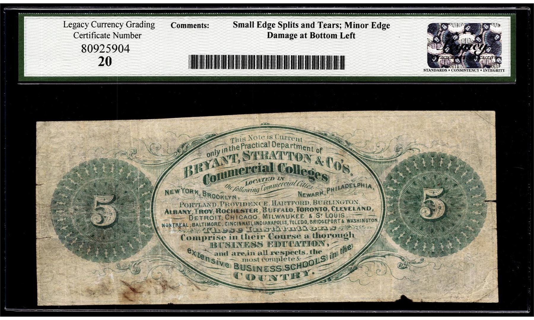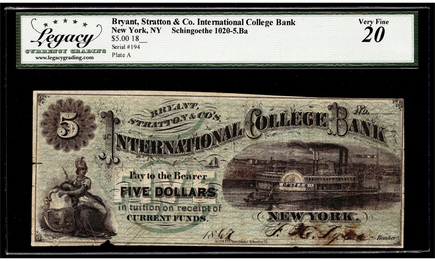 One 1867 $5 Bryant Statton & Co Int'l College Bank Note New York, NY Legacy Very Fine 20. Legacy Graded.
