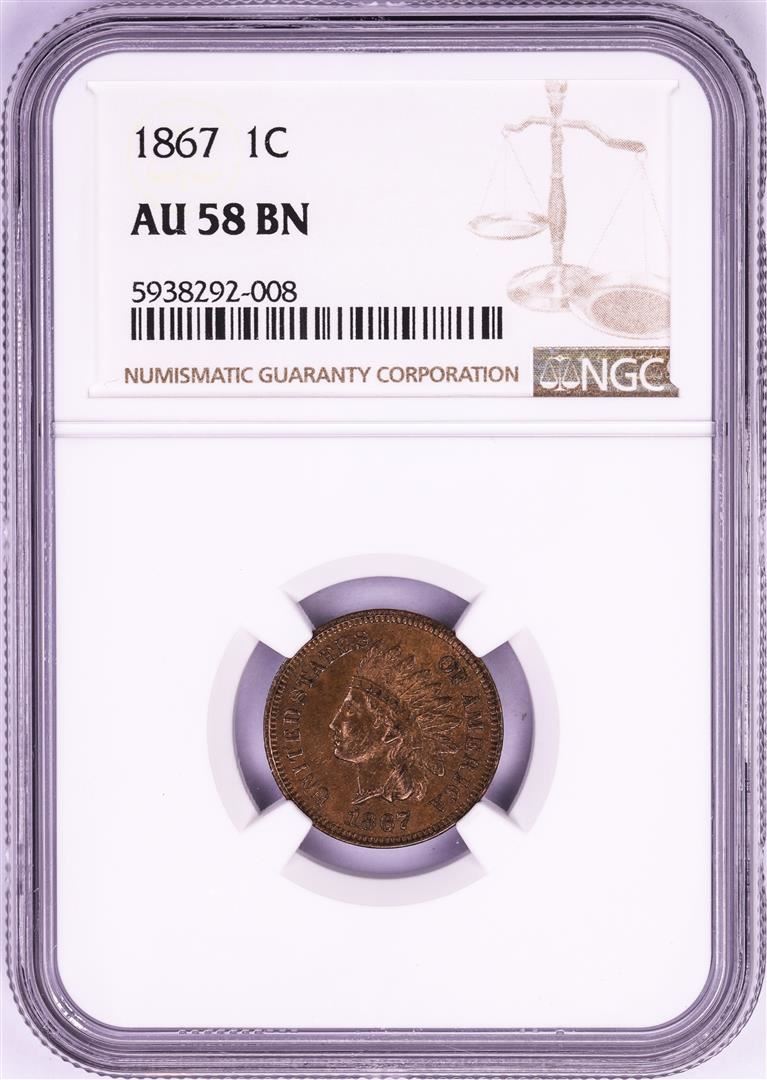One 1867 Indian Head Cent Coin NGC AU58BN. NGC Certified.