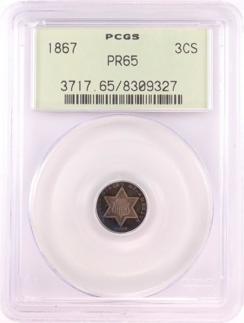 One 1867 Proof Three Cent Silver Coin PCGS PR65 Old Green Holder Nice Toning. PCGS Graded.