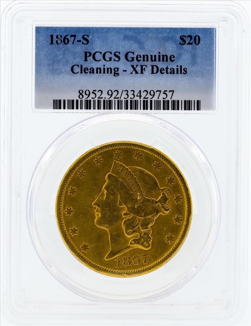 One 1867-S $20 Liberty Head Double Eagle Gold Coin PCGS Genuine Cleaning XF Details. PCGS Graded.
