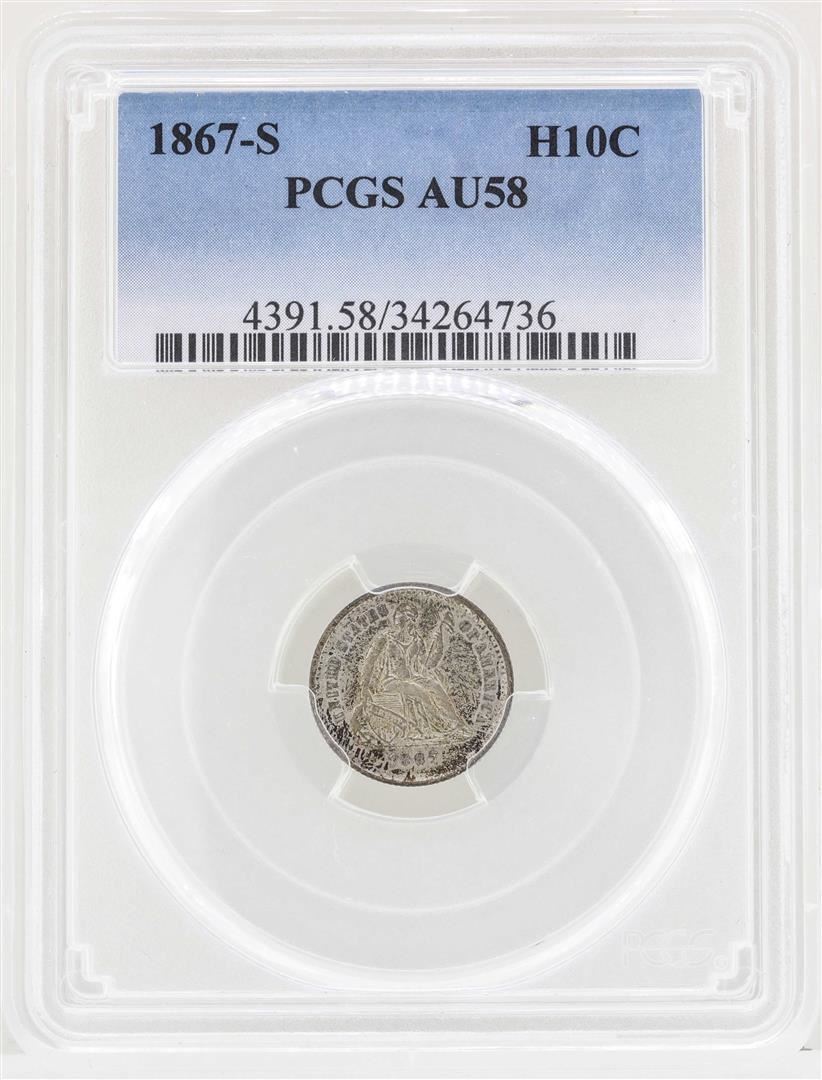 One 1867-S Seated Liberty Half Dime Coin PCGS AU58. PCGS Graded.