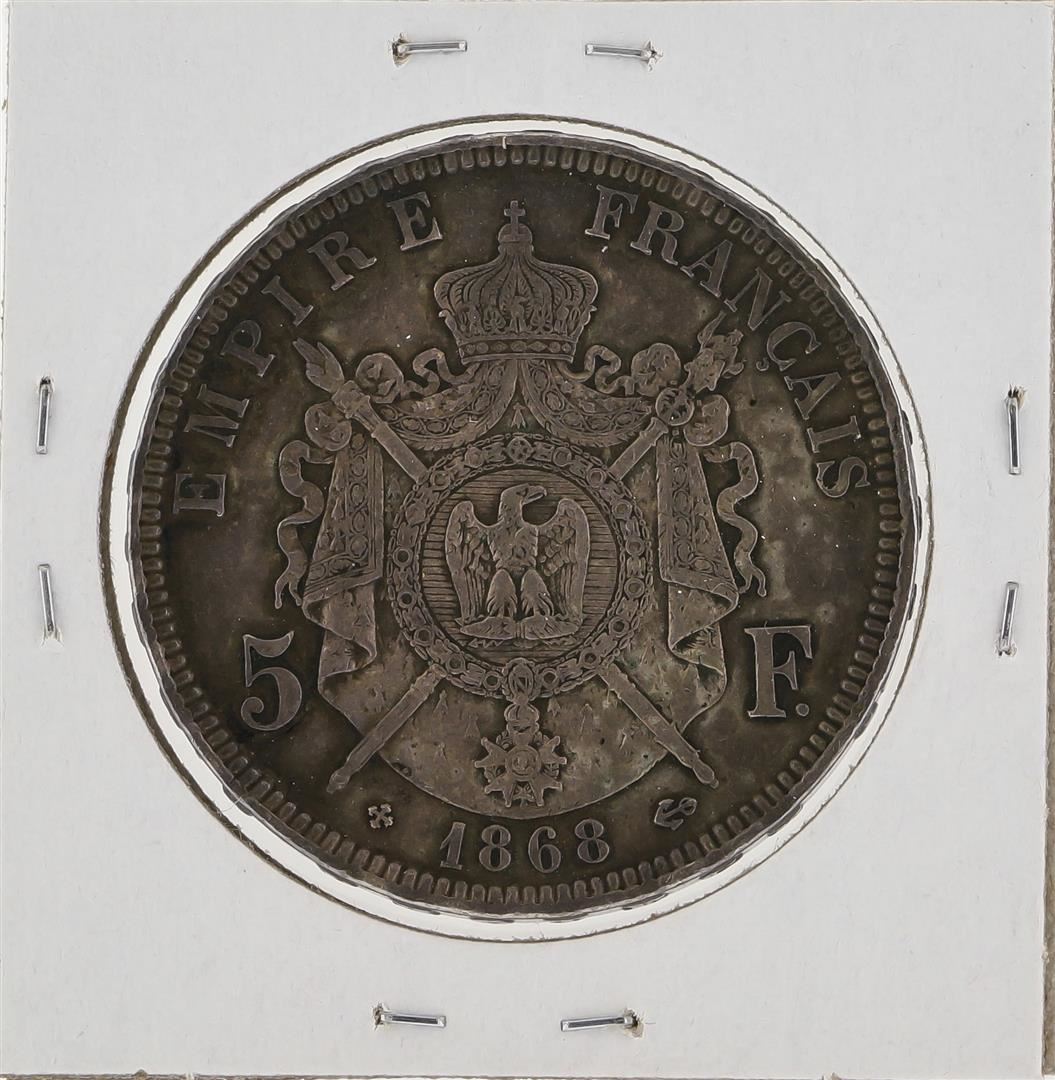 One 1868 France 5 Francs Napolean III Emperor Silver Coin.