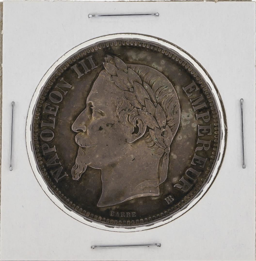 One 1868 France 5 Francs Napolean III Emperor Silver Coin.