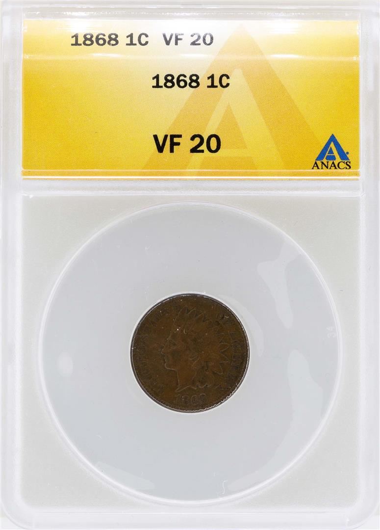 One 1868 Indian Head Cent Coin ANACS VF20. ANACS Certified.