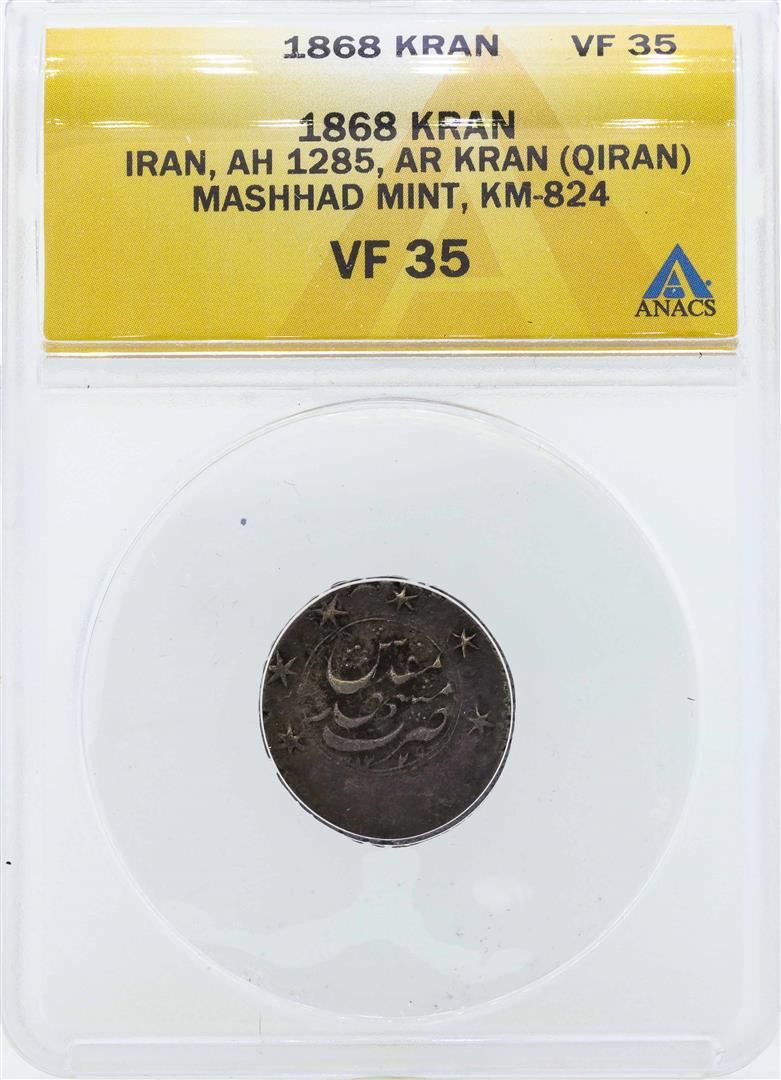 One 1868 Kran Iran AH 1285 Mashhad Mint Coin ANACS VF35. ANACS Certified.