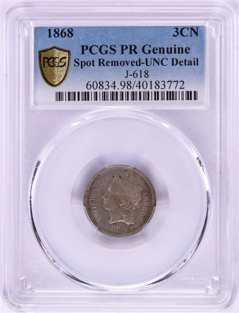 One 1868 Pattern Proof Three Cent Nickel Coin PCGS PR Genuine Detail.
