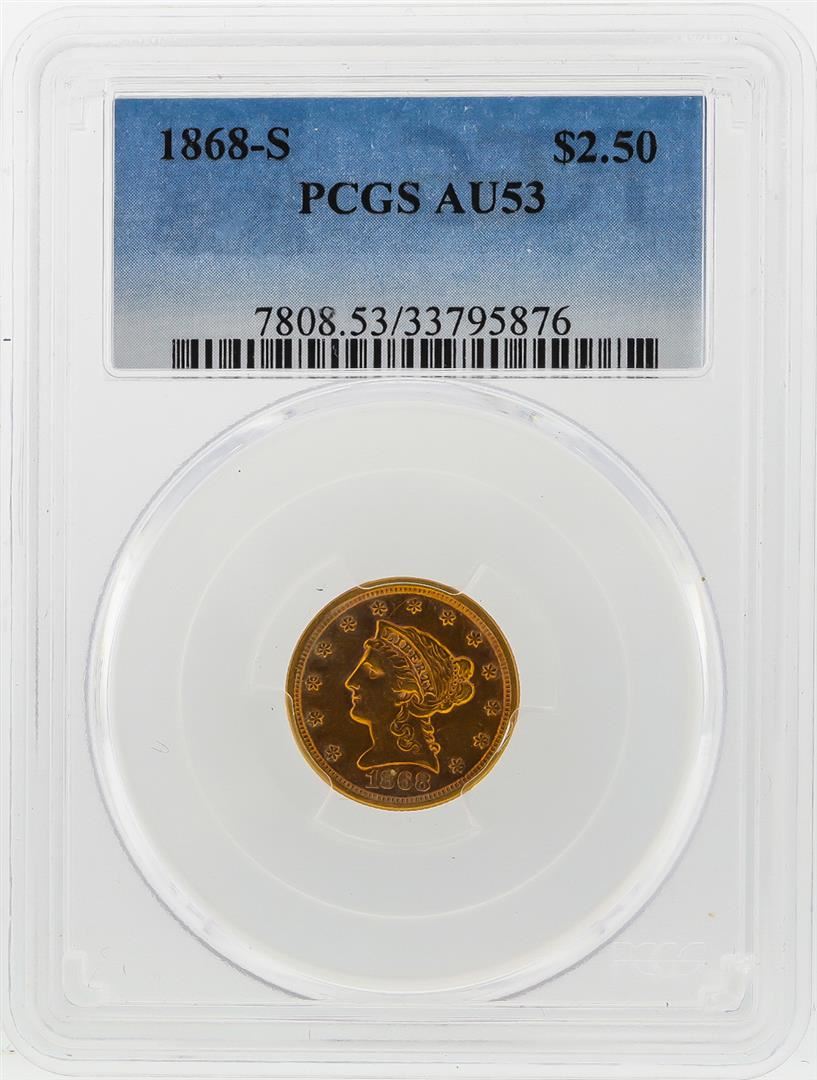 One 1868-S $2 1/2 Liberty Head Half Eagle Gold Coin PCGS AU53. PCGS Graded.