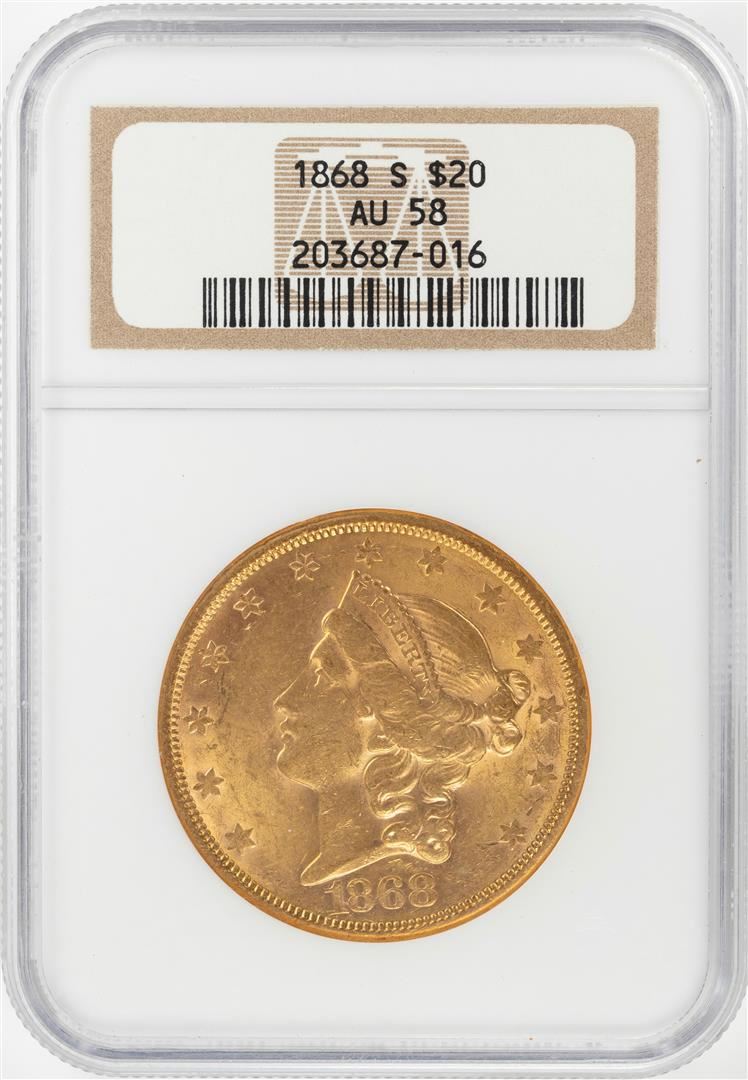 One 1868-S $20 Liberty Head Double Eagle Gold Coin NGC AU58. NGC Certified.