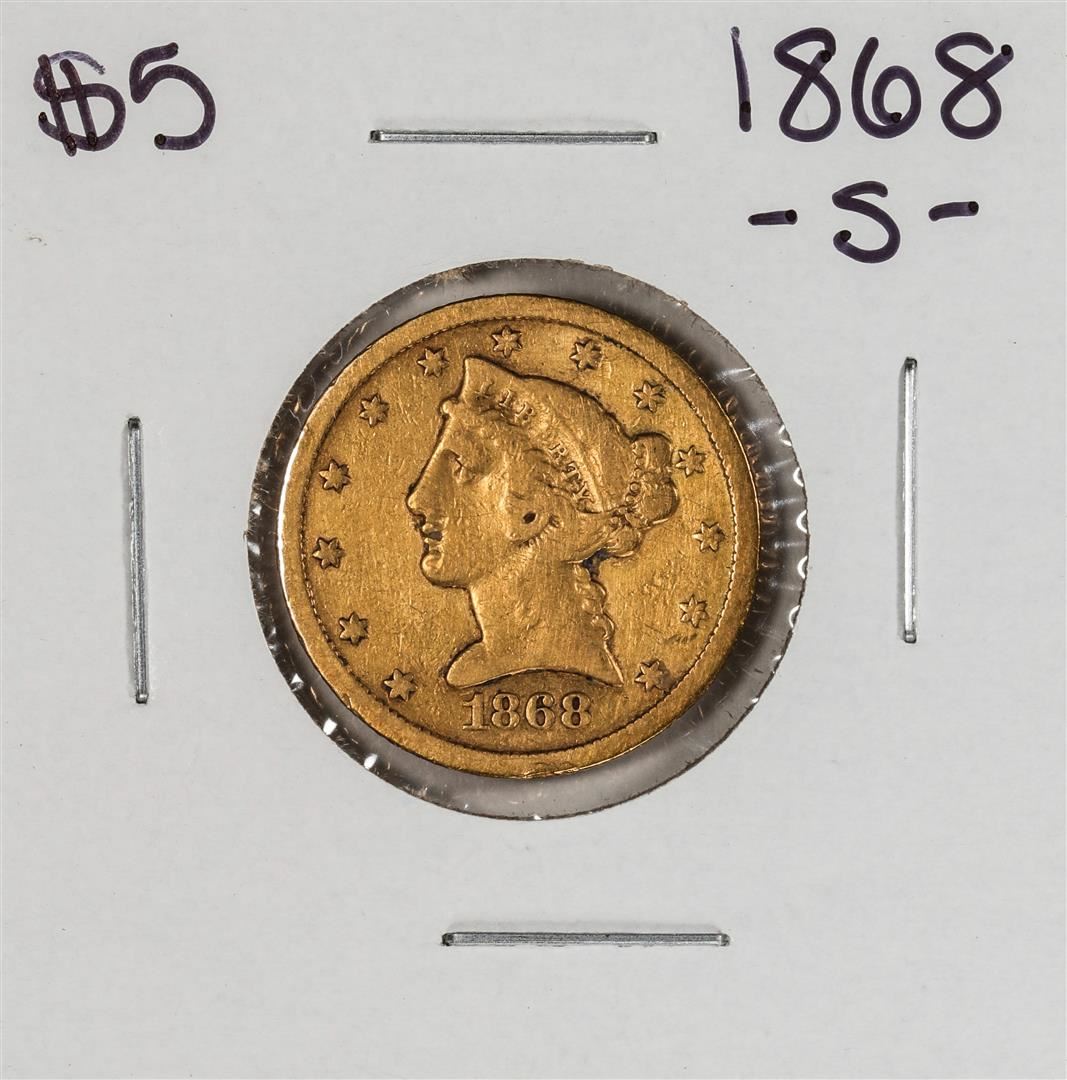 One 1868-S $5 Liberty Head Half Eagle Gold Coin.