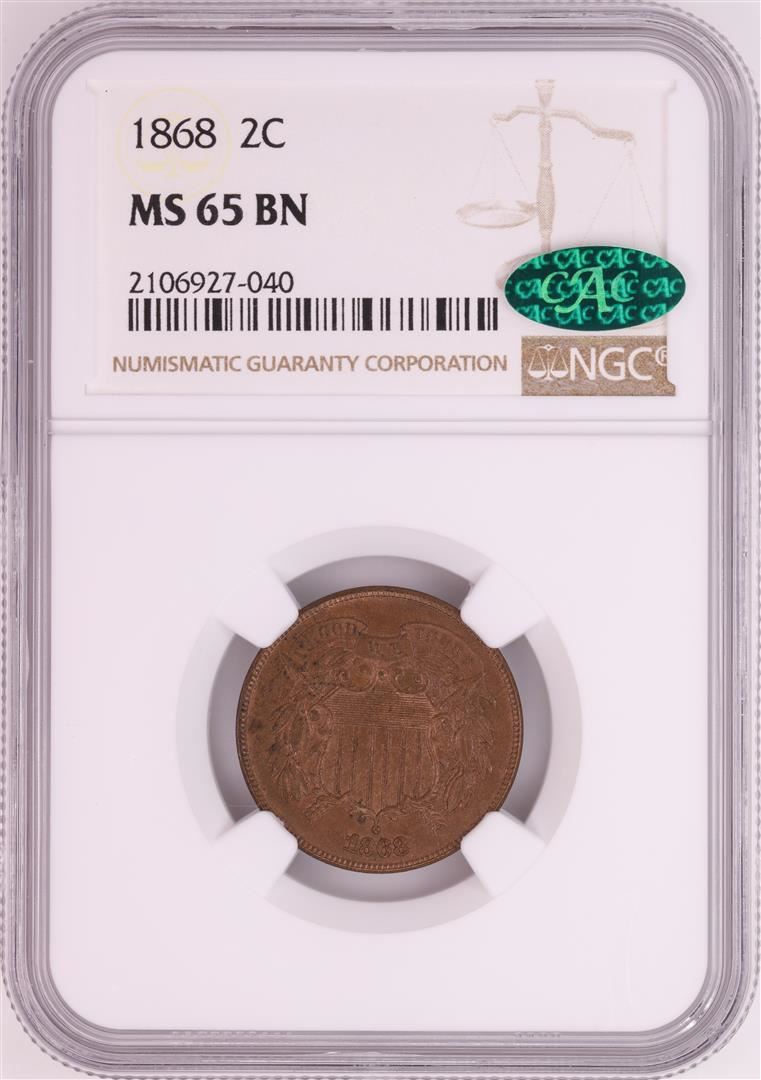 One 1868 Two Cent Piece Coin NGC MS65BN. NGC Certified.