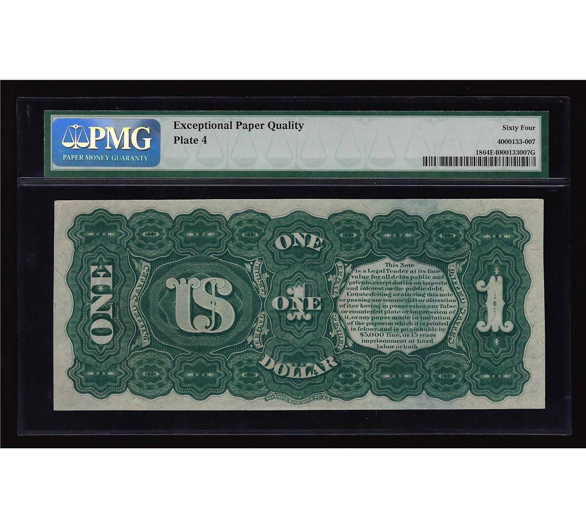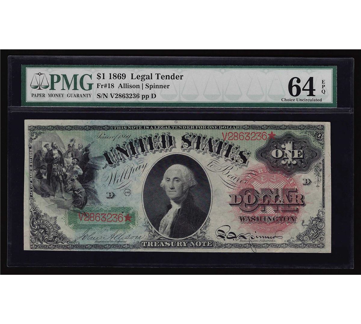 One 1869 $1 Rainbow Large Size Legal Tender Note PMG Graded Choice Uncirculated 64 EPQ. Series of 1869 one dollar bills are commonly called "Rainbow" notes by collectors. This nickname comes from the color changing paper these bills were printed on. All 1869 one dollar notes were signed by Allison and Spinner. 1869 one dollar bills feature a portrait of George Washington and artwork showing The Embarkation of Pilgrims. 1869 ones are common but they are popular. PMG Certified.