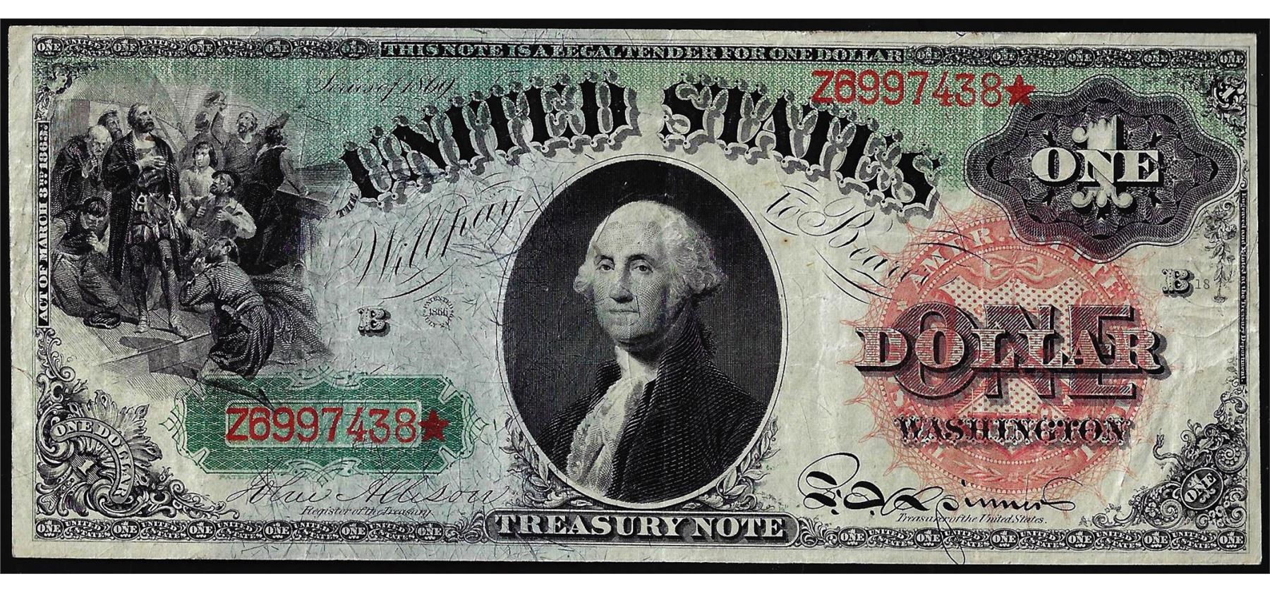 One 1869 $1 Rainbow Legal Tender Note.
