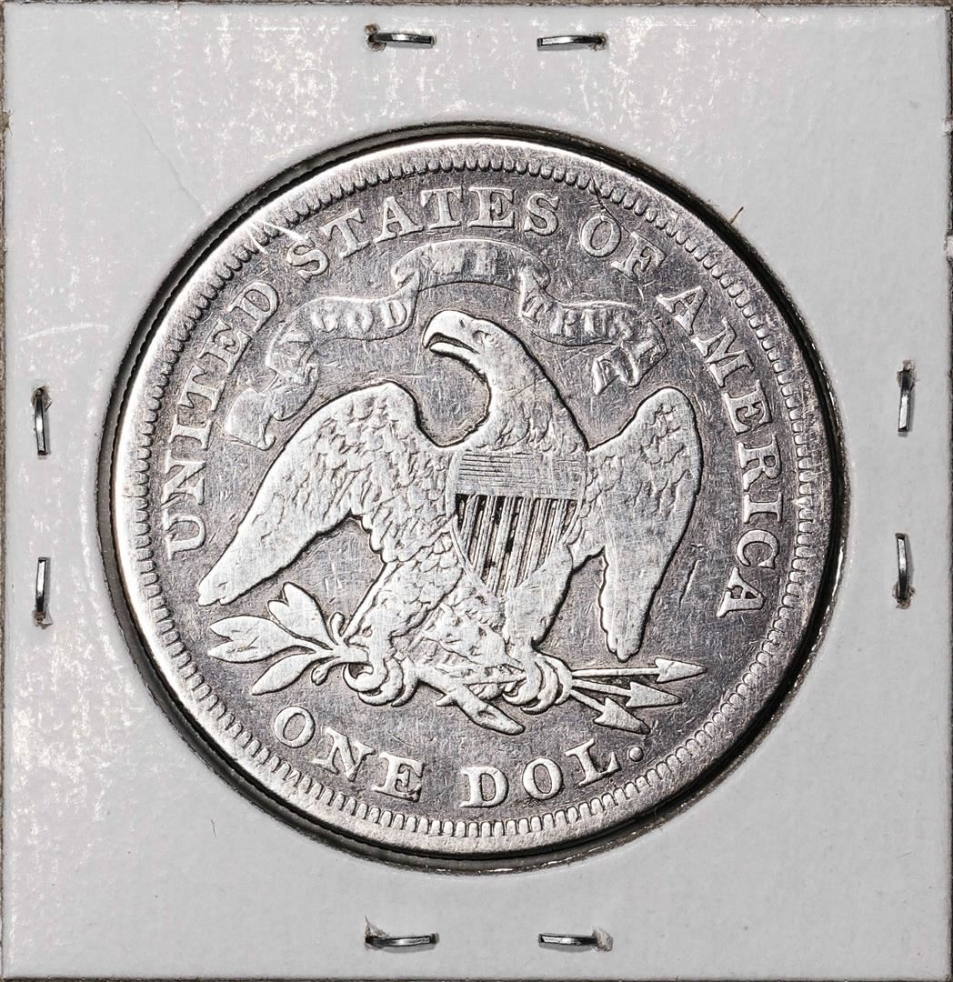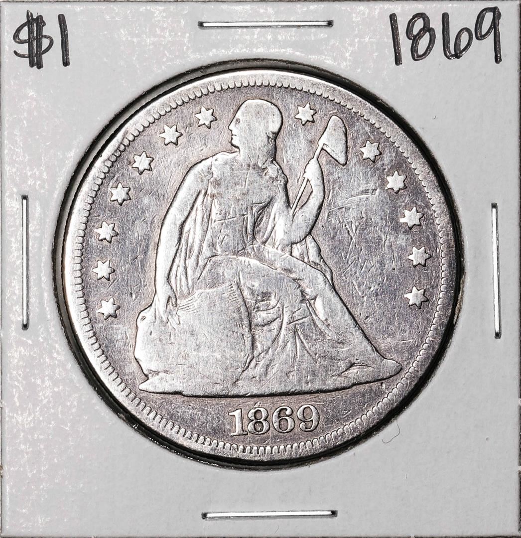 One 1869 $1 Seated Liberty Silver Dollar Coin.