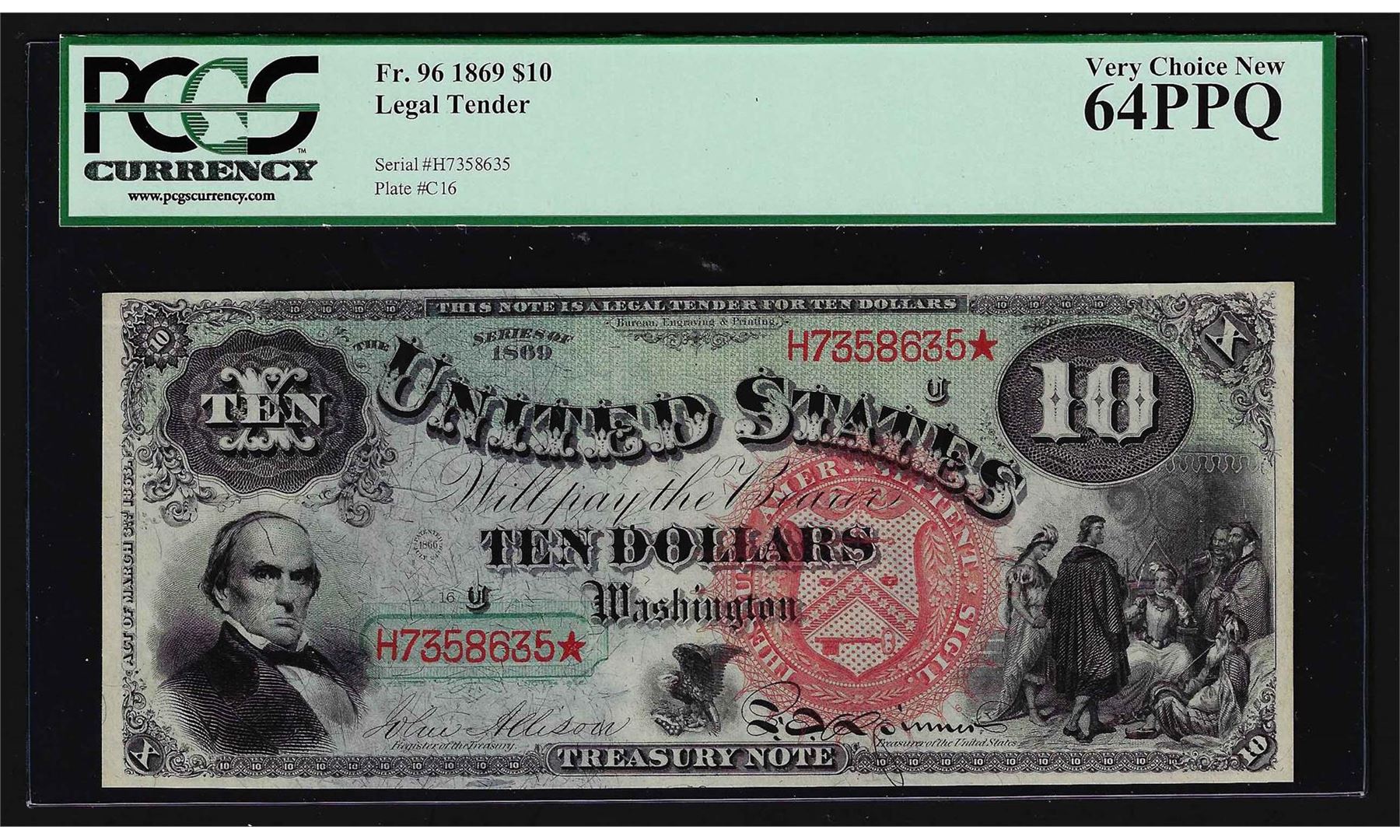 One 1869 $10 Legal Tender Large Red Seal Rainbow Note PMG Very Choice New 64PPQ. PMG Certified.