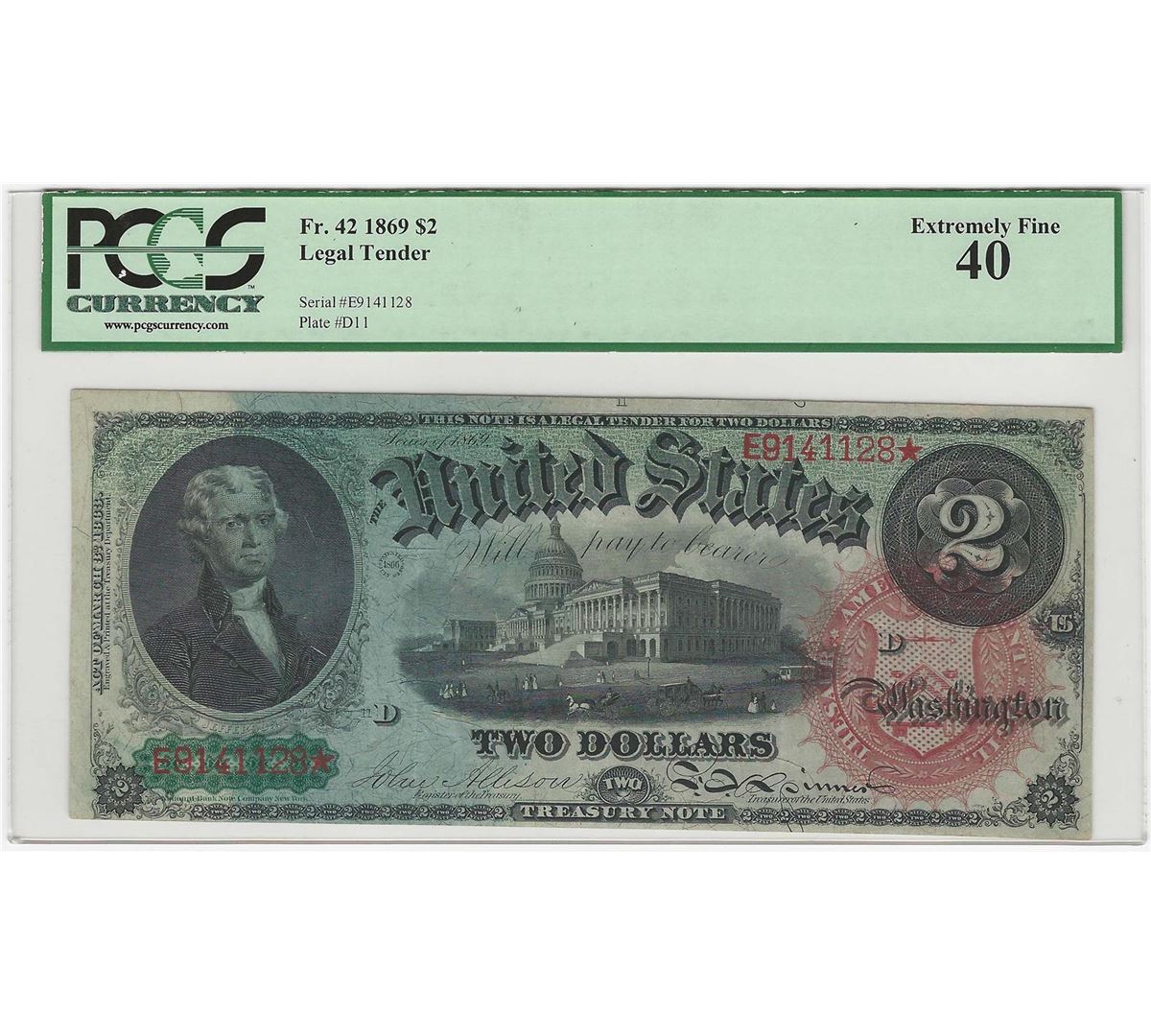 One 1869 $2 Rainbow Large Size Legal Tender Note PCGS Graded EF40. PCGS Graded.