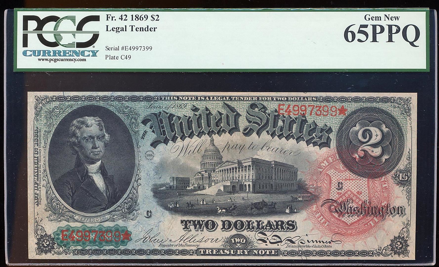 One 1869 $2 Rainbow Legal Tender Note Fr.42 PCGS Graded Gem New 65PPQ. The $2 denomination is by far the scarcest of the four lowest-denomination notes from the 1869 Rainbow series. It's a note that is seldom encountered with the combination of brightness, margins, and vibrant color that this piece possesses. Displaying excellent centering and providing great eye appeal overall, this beauty is sure to provide its new owner with plenty of enjoyment for years to come. PCGS Graded.