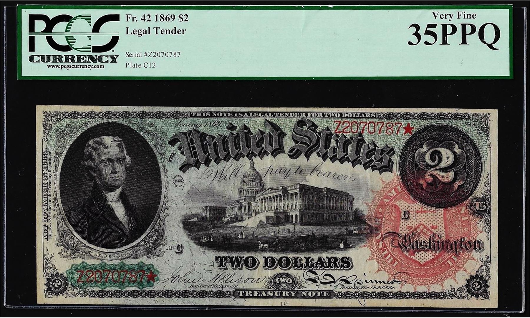 One 1869 $2 Rainbow Legal Tender Note Fr.42 PCGS Very Fine 35PPQ. PCGS Graded.